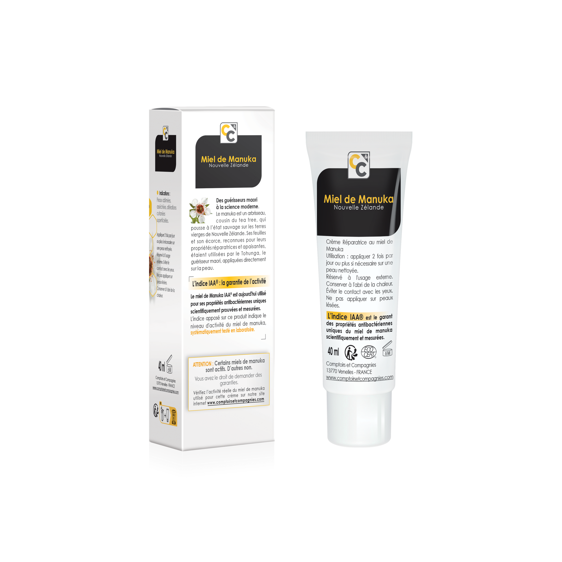 Notre crème réparatrice certifiée bio Ecocert est formulée de 40% de miel de Manuka IAA10+ qui favorise la réparation des peaux abîmées et asséchées et apaise les irritations et les rougeurs. Le miel de Manuka est reconnu pour ses propriétés réparatrices et son action sur la sphère cutanée, il nourrit intensément la peau. Associé à l'huile de jojoba et au beurre de karité, la peau est préservée et protégée.