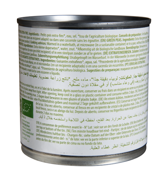 Petits pois extra-fins*, eau, sel.*Issu de l'agriculture biologique.