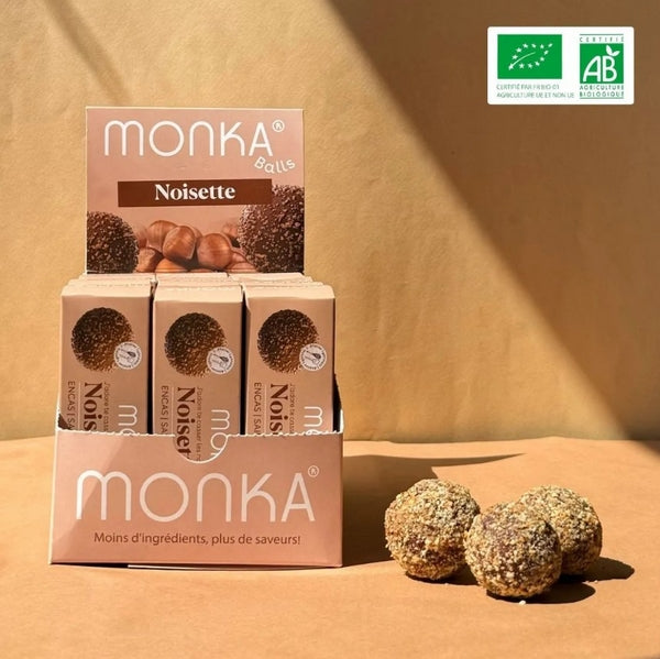 Boîte de 3 balls bio de 18g chacune. Vendu en prêt à vendre de 12 boîtes. Saveur : noisette (prêt à vendre)