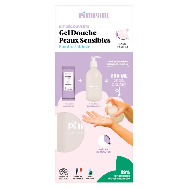 Ce kit contient 1 bouteille 300ml + 1 recharge de gel douche en poudre à diluer. Une recharge en poudre de 25 g à diluer avec de l'eau du robinet permet de fabriquer 250 ml de gel douche